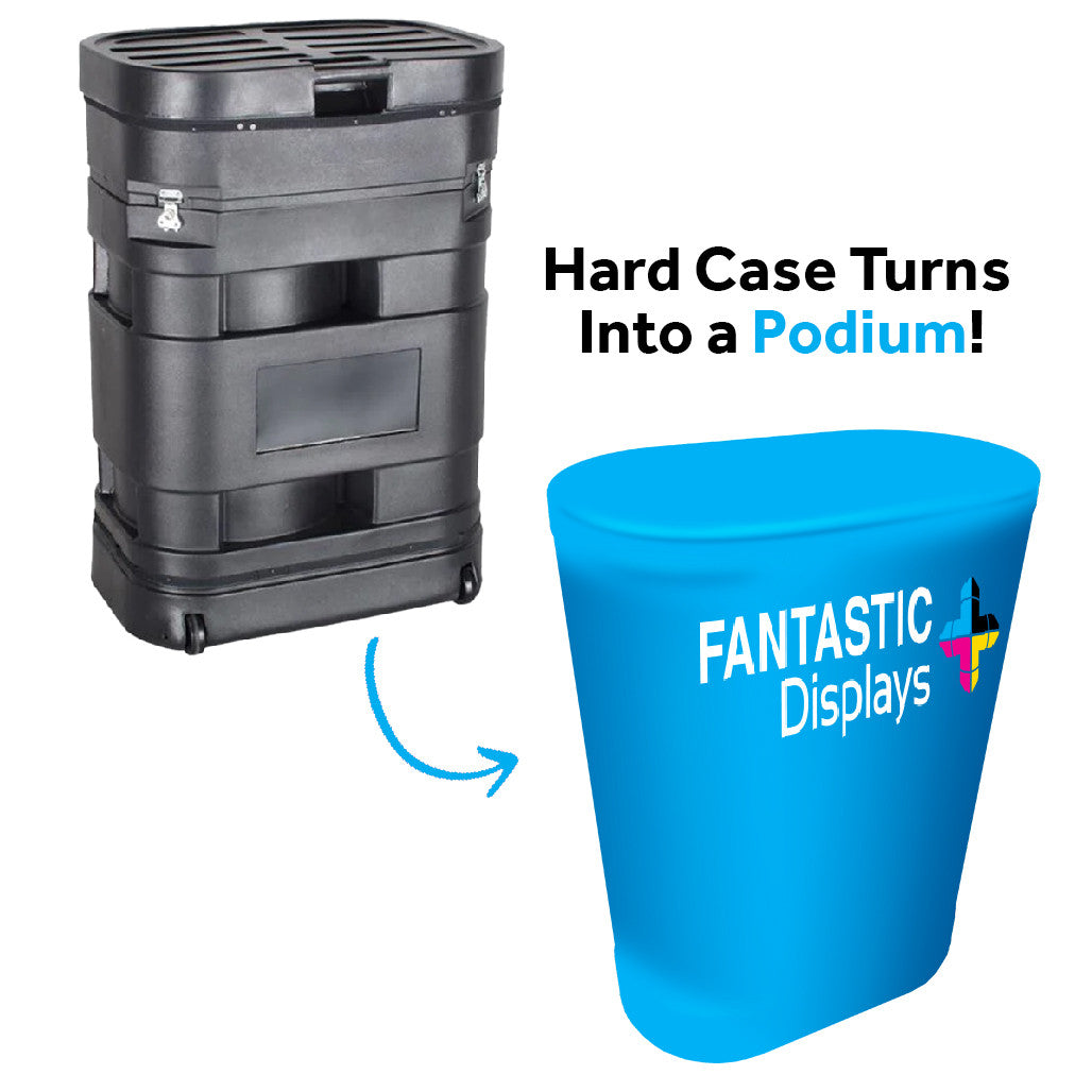 The 8 foot Standard display booth package configuration contains all the standard essentials for your booth. A large 8-foot curved pop-up display sets the perfect backdrop, complete with all the elements of a powerful brand. Designed to focus on information delivery and product showcasing, setting the ground for both first impressions and detail-filled campaigns. No element from large scale displays to tabletop literature holders is left forgotten, and your brand's presence will be prominent and memorable with a complete design, utilizing the best trade show products that we offer. All of our trade show booth kits include custom graphics and logos that you provide. Designed for your convenience, all the elements are carefully hand-selected with your needs and wants in mind. Get the most impact and unique designs! You are just clicks away from a complete display booth setup! This trade show booth display package features a fabric tube backdrop display.